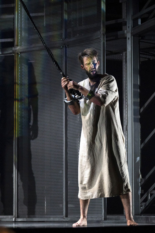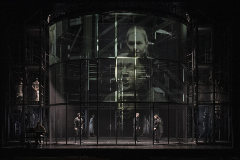 Anna was inspired by panotopian prisons, and wanted to create a foreboding structure mirroring the circular Glyndebourne auditorium. She uses mesh as a gauze to create textured surfaces for projection, at the same time allowing the audience to see the live performer at all times.